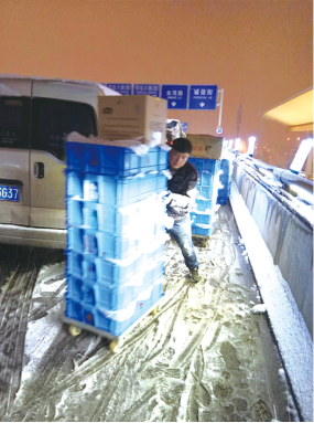 春運臨近,鐵路沿線門店的配送難度異常巨大,配送車輛因為暴雪錯過安檢時間,最終配送人員利用兩天凌晨分4次配送,保證了門店的正常供貨。鎮江的配送員馬師傅在為地下門店配送時,因為樓梯積雪過多太滑而摔倒受傷。
