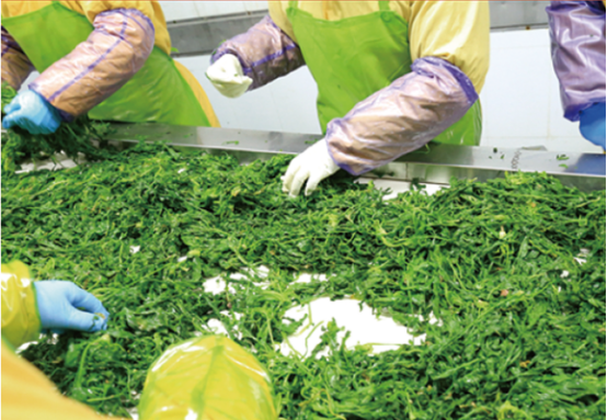 首先進行初步挑揀,工人們站在傳送帶旁仔細翻看從前三道清洗池傳送上來的薺菜,主要是為了挑出黃葉、雜草,并檢查是否有夾雜其它異物,初步挑揀完畢后會被再一次傳送進第四道清洗池。